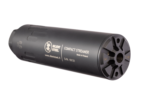 QDL-versionen av Silent Steel Compact Gen 2 - Kompakt flowthrough dämpare för halv- och helautomater, från finska Silent Steel
