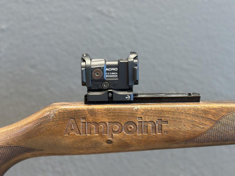 Aimpoint Acro är Aimpoints minsta sikte, särskilt lämpligt för pistoler och andra kompakta vapen. Nytt för 2022 är att Aimpoint även börjat ta fram fästen för lite större plattformar. Bl.a. kan man som på en av bilderna få ett mycket lågt montage på en dubbelstudsare! Med dessa fästen kan man mycket väl se Acron som den nya Micron!
