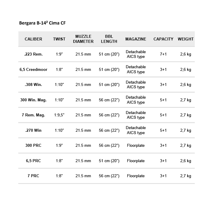 För dig som vill ha en traditionell cylinderrepeter i ett hypermodern utförande kommer här Bergara B-14² CIMA CF. Kolven är i kolfiber, och pipan är kolfiberlimmade. Tack vara detta blir vapnet så lätt som 2,6 kg för de versioner som kommer med 51 cm pipan!
