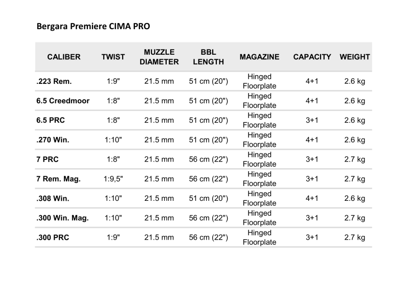 The CIMA PRO represents the pinnacle of Bergara’s pursuit of precision, innovation, and craftsmanship. It is not simply a rifle, but the embodiment of decades of expertise in barrel-making and firearm design, elevated through the use of cutting-edge technologies and premium materials. Designed for hunters and shooters who demand the very best, the CIMA PRO delivers a seamless balance between lightweight construction, rugged dependability, and refined performance.