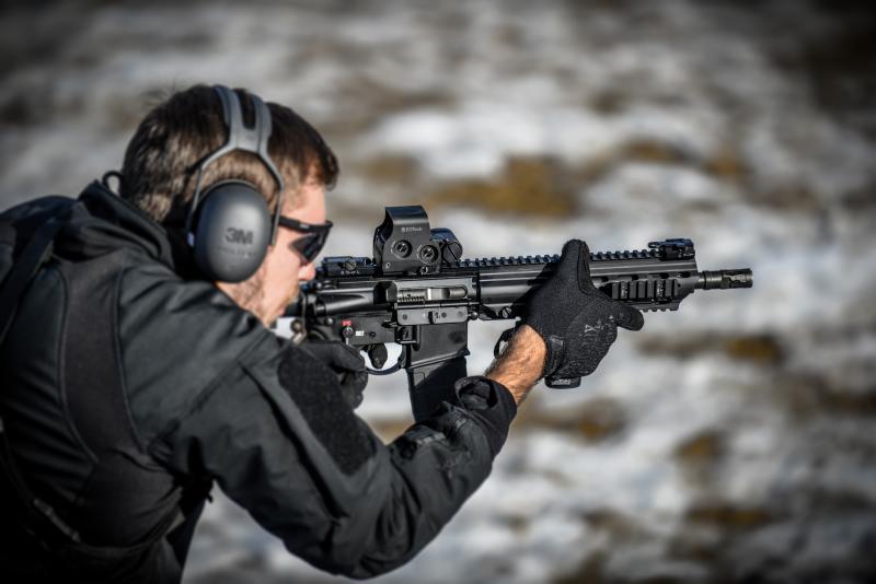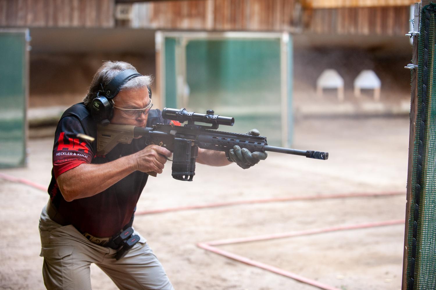 The semi-automatic rifle in a AR-10 design featuring the reliable G36 gas piston system in high caliber .308. Now completely operational on both sides. Suitable for all static and dynamic rifle disciplines.