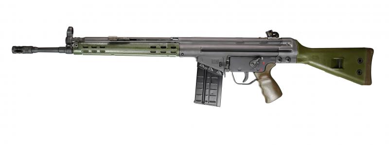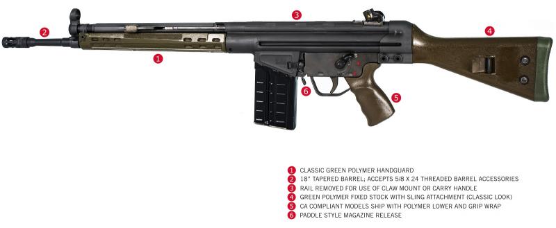 "The GI rifle features a Parkerized finish with classic green furniture, 18" tapered barrel and a classic "SEF" steel lower. The removal of the precision-welded top rail allows the use of original claw mounts and carry handles.