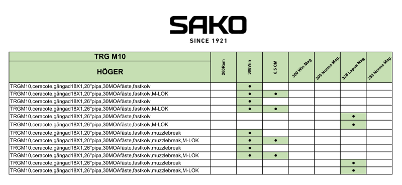Vapnet i grundutförande kan fås i antingen .308 Win, 6,5 Creedmoor eller .338 Lapua Magnum. Fler kalibrar finns att beställa som växelsats. Utöver flera kalibrar kan vapnet även beställas i olika färger (svart eller beige) och med olika fästsystem på handguarden (SAKO:s egna eller det nu standardiserade M-LOK systemet). Se grafik för möjliga val. Vi återkopplar alltid efter att ni lagt en beställning för att se så att allt är som det ska och att just er kombination går att beställa.