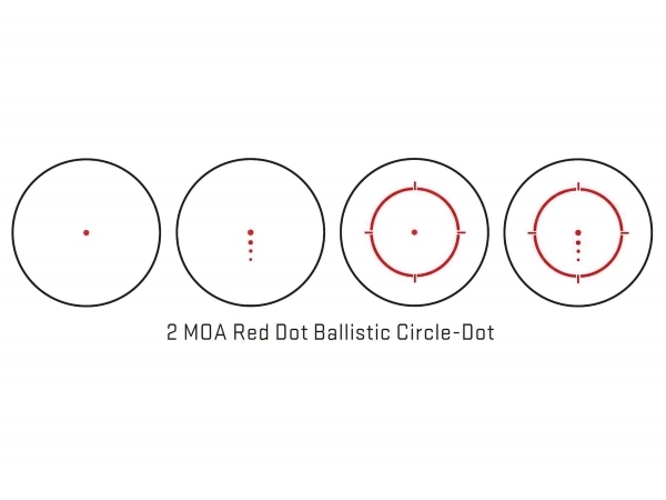 Modellen har tre inbyggda riktmedel som kan växlas mellan. Punkt (2 MOA), Circle Dot (65 MOA cirkel med 2 MOA centrumpunkt) och Circledot med ballistisk gradering. OBS, på en av bilderna finns även en retikel med ett kors i. Vi säljer endast Circle dot retikeln, alltså den vänstra versionen UTAN ett kors. Upp till 100000 timmars batteritid (>10år) med solcell och automatisk aktivering vid rörelse (MOTAC™). ROMEO4T har en otroligt solid konstruktion i 7075-T6 Aluminium och möter kraven på IPX-8 (vattentät till 20m i 30min).