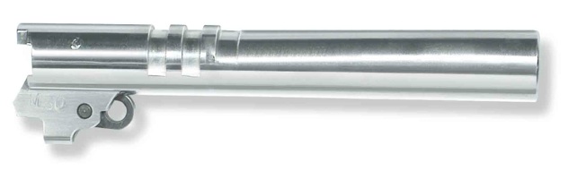 5” highest quality threaded bull barrel made in stainless steel, conventional grooved, 6 grooves, CNC machined by SPS, oversized in order to be fitted. Ramped barrel. Polished stainless steel finish. Available in calibers 9x19, 38Super, .45ACP.