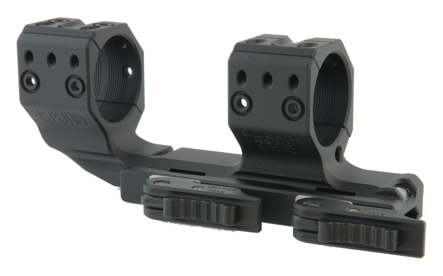 Quick detachable cantilever mount featuring side clamp and dual levers on the left side of the mount, with tensioning screws on opposite side of the mount body. Absolute co-witness most clip-on NV units on AR platforms. Allows the scope to be mounted 40 mm/1.57” farther forward than with a non-cantilever mount.