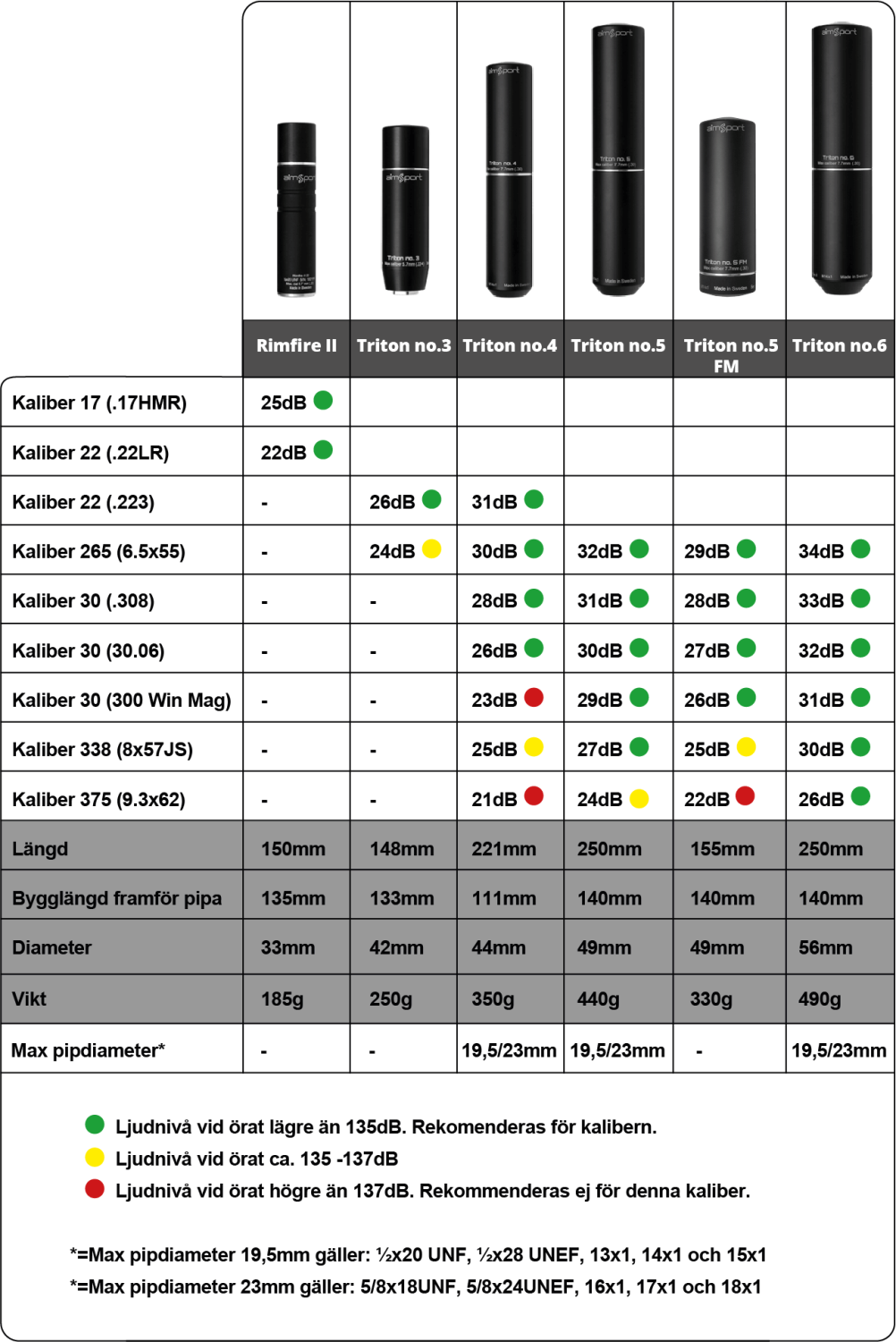 Denna dämpare ersätts av någon av Triton no. 4 till no. 6 i den nya numbersserien. Vilken modell som är rätt för dig beror på kaliber och om du prioriterar dämpning eller vikt. Se bild nedan för de olika alternativen i numbersserien. Du hittar dem även som relaterade produkter längst ned på denna sida.